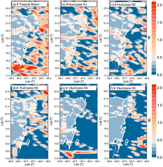 The entire region was equally affected by the passage tropical storms and minor hurricanes (H1 and H2) (Figure 9a–c). Major hurricanes (H3-H5) passed more frequently over the northern region (Figure 9d–f).