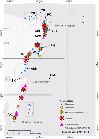 Mesotrophic and eutrophic sites with DIN of 6.71–110.48 µM were recorded mostly in the northern region, with the highest DIN concentration in the study area (110.48 µM) in CM (Playa del Carmen). Other isolated records with medium to high DIN in central and southern regions were recorded in the CM (Shambala, Chávez, Mahahual), SK, and AX (Figure 10).