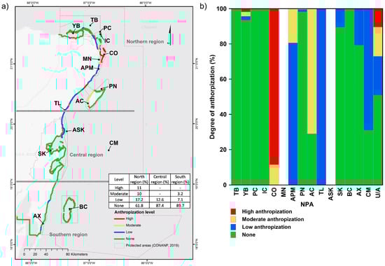 Degree of anthropization in Quintana Roo (modified from Cruz et al., 2019). (a) By regions. (b) For each NPA and for the Unprotected areas. The NPAs are listed from north to south, except for the Mexican Caribbean Biosphere Reserve (CM), and the Unprotected areas (U/A) are listed at last because they occur all along the coastline (See Table 1 for abbreviations).