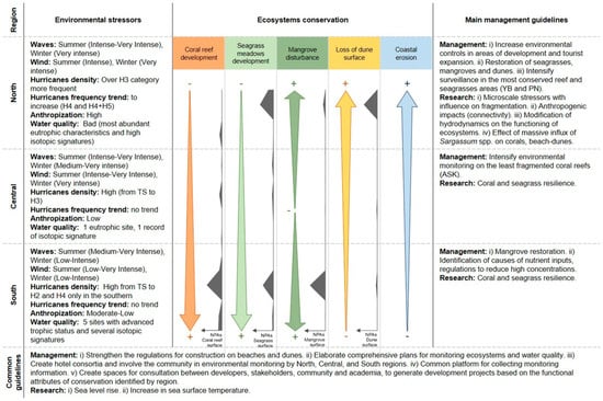 The accelerated rate of environmental degradation of the Mexican Caribbean coast is alarming. In this work, spatial analysis procedures were applied to study relationships among wave and wind climates, water quality, and environmental degradation of the principal coastal ecosystems. We found an increasing North-South gradient in the preservation state of the coastal ecosystems, related to the degree of anthropization of the coastline. In the north, all analysed stressors exert high pressure on coral reefs, seagrass meadows, mangroves, and dunes, and cause chronic coastline erosion. The coastal ecosystems of the central and southern regions are more mature and healthier, and the most significant stressor is reduced water quality. The north has been most hit by high-intensity hurricanes, the frequency of which has increased in the Mexican Caribbean over recent decades. The status of conservation of the ecosystems, added to the long-term intensification of environmental pressures, particularly high-intensity hurricanes, will induce further deterioration if a coordinated management scheme is not adopted by decision-makers. To ensure effective coordinated management, plans should be made on a regional scale using shared guidelines. Spatial analysis procedures aid in prioritizing and adapting the shared guidelines depending on the identified major stressors and the preservation state of each region in the Mexican Caribbean.