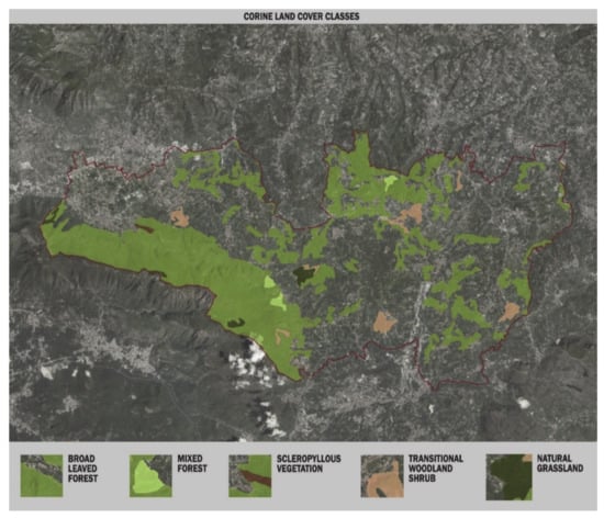 - Regulation Function. This relates to the landscapes’ natural capital’s capacity to make the ecosystem processes work with their direct/indirect benefits to human beings. According to the Corine Land Cover (CLC) [81] classification, the local landscape is shaped by a sizeable part of the broad-leaved forest and transitional woodland shrub, while the presence of moors, natural grassland, mixed-forests, and sclerophyllous vegetation is more limited and widespread. The natural classes of land cover indicate high values of ecological integrity and biodiversity in the focus area, considering how the regional park provides relevant ES for the surroundings (Figure 4). This means that each new action should be designed carefully for ensuring the ecological integrity of the area;