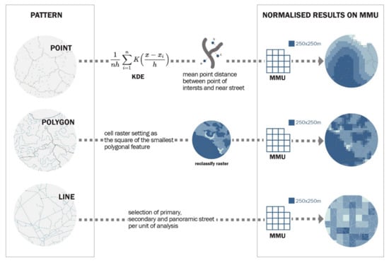 In the PRP case, the issue of spatial representation of the indicators was addressed through spatial modeling of the multicriteria problem, which contributed to improving the local landscape knowledge. In particular, authoritative data sources (Territorial Planning Offices, National Statistical Institute, etc.) were matched with open-source data, and the volunteered geographic information (VGI) [87] provided by Panoramio and OpenStreetMap applications. The spatial representation process of the indicators is shown in the next paragraph.