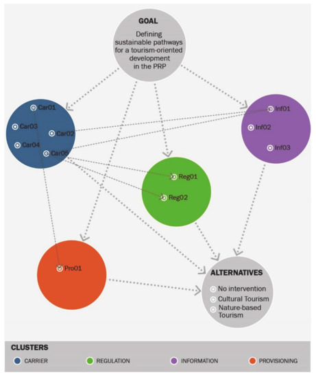 Specifically, the ANP was divided into four main phases. The first phase allowed the main goal of the analysis to be defined, related to “Defining sustainable pathways for a tourism-oriented development in the PRP”. Subsequently, the method sorted the decisional problem into two fundamental elements: nodes, compounded by the indicators, and clusters that constitute criteria (landscape functions). The third and fourth phases were carried out thanks to two focus groups with a team of experts.