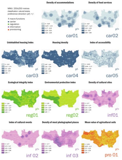 - Information Function. Specific functions involve cultural ecosystem services that provide cultural, artistic, and aesthetic information. In this case, they were represented by the following three indices: Density of cultural sites; index of cultural events; density of most photographed places;