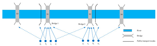 Many megacities have developed along trunk rivers, such as Minneapolis, St. Louis, Vienna, Shanghai, and Nanjing. Although trunk rivers provide convenient shipping conditions and boost economic development, they divide a city into several subareas. Travelers between subareas have to take a river-crossing channel to visit each other. With the rapid development of the economy and urbanization, the limited river-crossing channels become a bottleneck in the urban transport network. For instance, approximately 400,000 private vehicles and 600,000 commuters in Nanjing travel across the Nanjing Yangtze river bridge each day [1]. In the commuting peak period, cumulative commuters from both sides of the river travel across the bridge, such that the travel demand on the bridge is excessively high. High demands cause serious congestion on the bridge, which is shown by the over-congested scenario in which vehicles with limited headway repeatedly stop and go on the bridge during peak hours. To mitigate serious congestion on a channel, a large number of transport policies are assigned at a bridge to organize traffic flow during peak hours [2]. Road traffic signals, upstream of the bridge, are also adjusted to control on-bridge traffic volume to a certain level. However, this strategy can only relieve the congestion on the bridge. During peak hours, cumulative river-crossing traffic demands stop under the bridge and wait for the pass signal. As the queuing length grows, traffic congestion gradually spreads througout the entire road network. Investigations have shown that a traveler should take an average of 1 h to pass a bridge during peak hours, about 4.6 times longer than the ordinary situation.