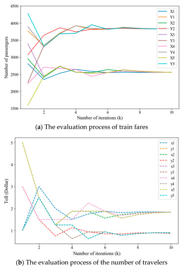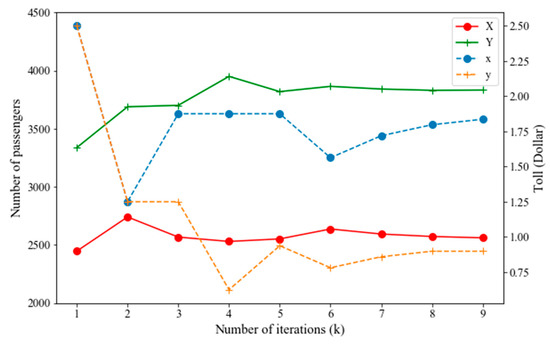 In Figure 2, the adjustment process of tolls on and during the trial-and-error procedure is presented by the dashed polylines and , respectively.