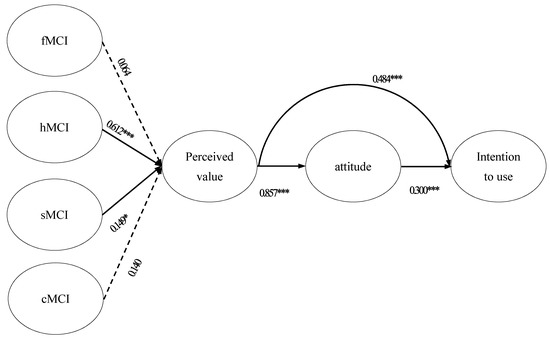 The hypotheses were verified, and the results are shown in Table 4. The findings reveal that the fMCI and sMCI of robot service restaurants significantly influenced perceived value. This implies that the suggested MCIs of robot service restaurants can be important factors of customer perceived value. Additionally, the customers with higher perceived value had a strong usage intention of the robot service in restaurants, as evidenced by the significant path coefficient from perceived value to usage intention. Figure 2 presents the results of the analysis.