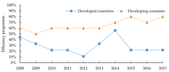 Due to the different levels of economic development and agricultural development, there are obvious differences in ASTI inputs between the G20 developed countries (Australia, Canada, France, Germany, Italy, Japan, the Republic of Korea, the United Kingdom, and the United States) and the G20 developing countries (Argentina, Brazil, China, India, Indonesia, Mexico, the Russian Federation, Saudi Arabia, South Africa, and Turkey). Figure 3 and Figure 4 describe the efficiency range and efficient proportion of ASTI in the G20 developed countries and the G20 developing countries from 2008 to 2017.