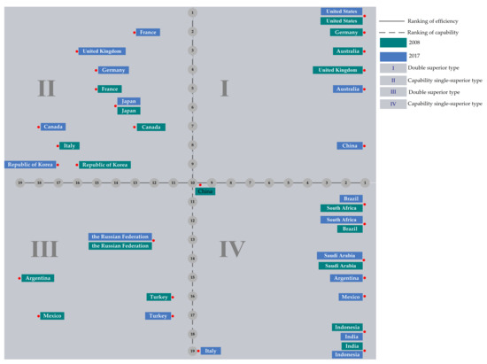The innovation efficiency and innovation capability are two important aspects of national ASTI level [50,51]. The efficiency of ASTI focuses on the relationship of transformation from input to output, that is, whether more output can be obtained under the given input or less input can be invested under the given output. The capability of ASTI is a comprehensive performance from the joint influence of input and output [46]. The efficiency of ASTI concentrates on innovation quality, while the capability of ASTI focuses on innovation quantity. This study integrated the analysis of the efficiency and capability of ASTI to locate the type of ASTI level and identify the type change for each G20 country, from both the innovation “quality” and “quantity” aspects.