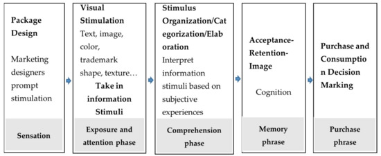In psychoanalytic theory, the procedure of information processing for consumers perceiving product packaging is made up of five sections [29,30].