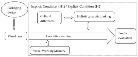 Firstly, product packaging is exposed and noticed, consumers recognize and categorize some visual elements or their combinations. Next, they use the features of some stimuli according to their own subjective experiences in the past and cause meaningful information stimuli. The concept of packaging design is inherently multidimensional, incorporating multiple elements such as texts, shapes, graphic designs, logos, sizes, colors, illustrations, materials, textures and so on [31,32,33]. Furthermore, memory will affect received information and the way interprets it; memory is the result of learning. The working memory system is used to hold information actively in the mind and to manipulate that information to perform a cognitive task [34,35,36]. Meanwhile, the information which has been received will create memory [37]. The external condition is an important condition when doing design-based related research [38,39]. Optimal conditioning is the creation of a strong association between the conditioned stimulus and the unconditioned stimulus [40]; these two kinds of stimulation are usually contained in associative learning: implicit learning and explicit learning. Implicit learning is a primitive process of apprehending structure by attending to frequency cues, while implicit learning is without awareness, using rules. Our research is carried out in the two conditions: the implicit condition and explicit condition. After consumers accept messages and digest them into impressions, they can be used to interpret information for purchase or for decision-making [41,42]. A response model of consumers to product packaging is proposed in Figure 1.