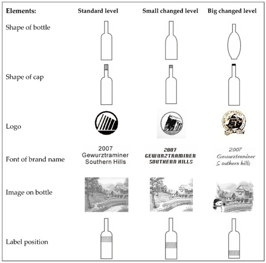 What design elements to choose? The visual elements are divided into two parts: (a). packaging graphics; and (b) packaging sizes and shapes. Specifically, packaging graphics are further divided into packing layout, image, color, and typography [43]. In pretesting, there were 12 items of elements listed, some of them were not visual elements but informational elements. We invited 12 German students and 12 Asian students to identify visual related items. As we expected, eight visual design elements were left at last. Color is important, but it is a quite complex matter in people’s perception, consumers seem to have personal and cultural preferences for some colors over others [44], and the size of wine bottle are always the same, 750 mL. We eliminated these two elements. At last, six selected design elements were shape of bottle, logo, font of brand name, shape of cap, image on bottle and its position.
