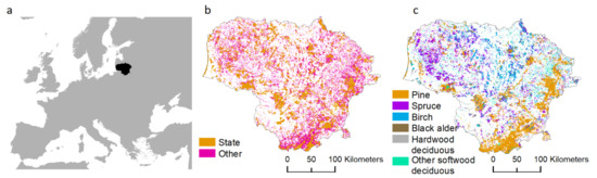 Location of the study area and forests in Lithuania: (a) Location of Lithuania in Europe; (b) forest ownership; (c) the most common tree species in a forest block. Sources of spatial data used in the background: (a) https://thematicmapping.org/downloads/world_borders.php, accessed on 3 March 2021 and (b,c) forest state cadastre [67].