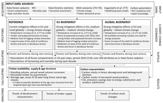 - Packalen, T.; Sallnäs, O.; Sirkiä, S.; Korhonen, K.; Salminen, O.; Vidal, C.; Robert, N.; Colin, A.; Belouard, T.; Schadauer, K.; et al. The European Forestry Dynamics Model: Concept, Design and Results of First Case Studies; European Commission, Joint Research Centre, Institute for Environment and Sustainability, Publications Office of the European Union: Luxembourg, 2014; p. 17. [Google Scholar] [CrossRef]