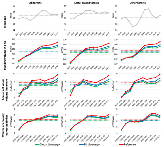 The projected development of selected attributes of Lithuanian forests during the coming one hundred years is summarised in Figure 3. Values for all forests are also split into components to separately illustrate the trends in state-owned and other (predominantly private) forests.