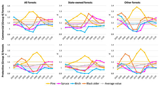 Even though the objective of Lithuanian forestry has been declared to be aiming for equal areas of age classes through the rotation, the K index remained above 1 in practically all cases analysed (Figure 4), suggesting the dominance of relatively more aged forest. Assuming that current forest management practices were continued, the resources of relatively more aged pine forests would accumulate during the first half of the simulated period—until the year 2060 in state-owned forests and 2070 in other commercial (Group 4, following the terminology accepted in Lithuanian forestry [18]) forests. After this, the K index would decrease; however, it would not reach a value of 1. The trends for pine in commercial forests were very much followed in protective (Group 3) forests, with just one decade being delayed. The development of the K index for other prevailing tree species indicated different trajectories—a decrease of the K value until 2060–2070 in commercial forests and 2070–2080 in protective forests, and then rapid increase for two–three decades, before becoming more or less stable. Some accumulation of old black alder stands in other forests at the beginning of the simulation period should also be mentioned. More detailed information about the areas of age classes during the next one hundred years is presented in the Appendix A (Figure A1 and Figure A2).