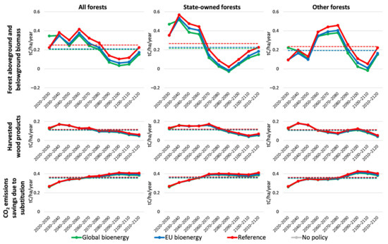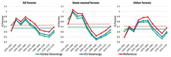 Assuming that current forest management principles are continued during the next one hundred years, no matter the climate change mitigation efforts, the total carbon balance should remain positive, suggesting that Lithuanian forests will continue to increase the volumes of accumulated carbon (Figure 5). Different climate change mitigation scenarios resulted in outputs which were very much followed in all cases analysed. Relatively, the largest volumes of annual carbon stocks per hectare were achieved under the conditions of the reference scenario, which assumed the least efforts to reduce climate warming and, therefore, under Lithuanian conditions, an increasing productivity of coniferous forests dominating in the country. Both scenarios which assumed increased climate change mitigation efforts (global bioenergy and EU bioenergy) resulted in similar trends of the total carbon balance, with slightly lower values for the global bioenergy scenario with the most ambitious climate change mitigation targets. The total carbon balance in all Lithuanian forests is expected to increase by 2060. After this, the balance is expected to decrease and continue to decrease until 2110. The balance in all forests started to increase again during the last decade covered by the simulations. If taking into the consideration state forests only, the total carbon stock changes should continue to increase to reach the overall highest values (about 1 tC/ha/year) by 2040. Then, they should start to decrease until 2080–2090, reaching the lowest values (~0.5 tC/ha/year), before starting to increase until the end of the simulation period. The decrease was temporally stopped during 2050–2060. The trends of the total carbon balance in state-owned forests are very much followed in other forests; however, with some delay of breakpoints. The total carbon balance in other forests was projected to increase until 2070–2080, with some reduction during 2040–2050. Bearing in mind similar areas of state and other (predominantly private) forests in Lithuania, in the decade 2060–2070, the other forests would contribute more to the carbon sequestration than the state forests and would keep this status until the end of the current century. The other forests would never reach the maximum total carbon balance values per ha, as achieved by state-owned forests. Additionally, the total carbon balance in other forests never became as low as in the state forests. Except for the current decade, the total carbon balance in all and state forests of Lithuania should remain above the average value for the whole simulated period during the next half-century. Rapidly increasing total carbon balance values in other forests meant that they started to exceed the average values for the whole century for 2050–2060 and maintained this until 2080–2090, under conditions of reducing carbon accumulation potential. There were two peaks projected in terms of the total carbon balance values for all Lithuanian forests—2030–2040, related to the overall maximum of carbon accumulation potential in state forests, and 2050–2060, when the carbon accumulation potential of state forests was still high and that in other forests was approaching its maximum values. The overall lowest carbon balance values were projected for the beginning of the next century, corresponding to the depression in carbon accumulation in other forests.