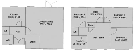 For modelling purposes ZP1 and ZP2 are a single model (semi-detached type), i.e., type ‘B3’ (Figure 2) and ZP3 is a model of the detached type, ‘C4’ (Figure 3). ZP1 and ZP2 have a common energy model in the design stage since the only physical difference was the mirroring of the plan along the party wall. Furthermore, the Standard Assessment Procedure (SAP) model used the same building fabric, energy system, and occupancy inputs for both dwellings leading to same outputs in terms of energy consumption. Finally, as will be seen later, single heat flux measurements were taken to represent wall and roof thermal transmittance in both dwellings. The difference in measured air permeability results between the two dwellings is also negligible. The as-designed energy models used the U-values and AP values listed in Table 2 above. Occupancy for the B3 model included two adults and one child; for C4 this was two adults and two children. In all models, the set point for the living room was set at 21 and 19 °C for all other rooms. The daily heating pattern for all dwellings was set for 06:00–10:00 and 18:00–23:00. Hourly weather data are typical meteorological year data (TMY) for Leeds, England located 38 km from the site. Table 4 shows more detail on how the models were constructed.