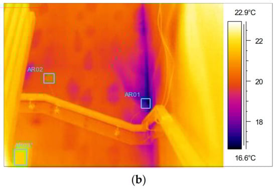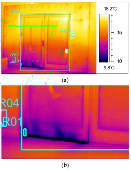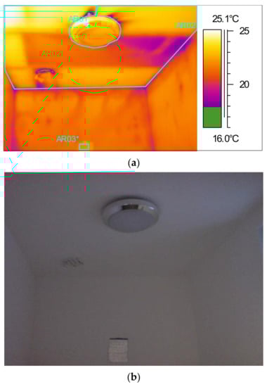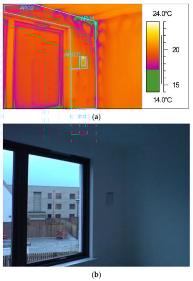 Example of thermal bypass during depressurisation in bedroom of ZP1, (a) thermal image, (b) photograph of thermal image location.