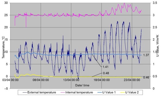 Third, hourly external temperature data from Weather Underground (www.wunderground.com/history/daily/gb/leeds/EGNM/date/2019-9-10, accessed on 28 July 2020) were used to align with external temperatures in the model, that is, the TMY data. Similar temperature patterns were aligned from the same period for the day with the lowest temperature in the model. That is, at a point in time where the model’s external data matched the actual external data, the model’s internal temperature response was matched with the actual internal measurements. Observing the lowest temperature is helpful in observing the greatest strain on the external fabric albeit this evaluation was performed in the end of summer/shoulder season and the lowest temperature was 6 °C. In summary, this second method was employed to find the wall thermal transmittance through temperature pattern alignment and validation. As will be seen, this method was explored due to the extraordinarily high results from the fabric testing.