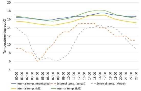 Figure 12 shows one day during the temperature alignment process (10 September 2019). External and internal temperatures are shown for M1 and M2. M1 resulted in 1 °C cooler internal temperatures in the model than what was monitored for the same period. For M2 validation using hourly temperature data for monitored period, the uncertainty result of NMBE was 0.8% and the result of CV(RMSE) was 5% for the as-built calibration, well below the required 10% and 30%, respectively.