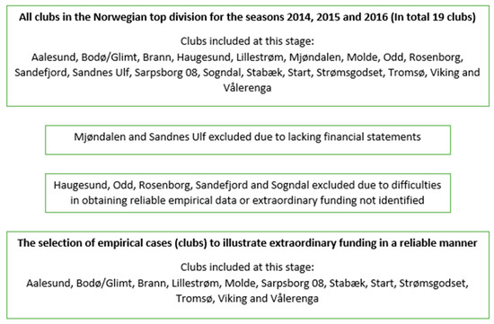 The empirical data consists of financial statements for Norwegian football clubs in the top division and their cooperating companies. In addition, we also build on a report by Deloitte [68], based on the consolidated financial statements reported to the Norwegian Football Association (FA). While the Deloitte report primarily is drawn upon to give an overview of the finances for Norwegian top division clubs in 2016 and partly 2014 and 2015, the empirical data derived from the financial statements for Norwegian football clubs and their cooperating companies are used to address extraordinary funding for the period 2014–2016. The two aforementioned time periods do not correspond, as the first Deloitte report was published for the 2016 season. The process of obtaining financial statements was, however, not straightforward. Thus, we focus attention on describing in detail how empirical cases were selected, and why they were selected.