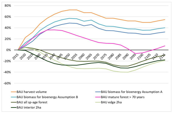 With Strategy BAU over the whole simulation period, the older forest with species-specific age criteria was 18% of the total forest area in Lithuania, while forest edge habitat was 11% and forest interior habitat was 7% of the total forest area. With Strategy INT over the whole simulation period, the older forest with species-specific age criteria was 16% of the total forest area in Lithuania, while forest edge habitat was 10% and forest interior habitat was 6% of the total forest area. For the reference year 2015, the figures are 22%, 13% and 8%, respectively.