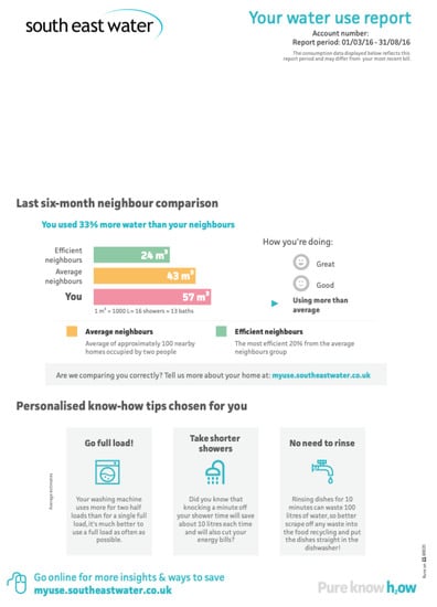 The design of these interventions typically involves displaying, through a graph, a household’s energy/water consumption compared to the average energy/water consumption of surrounding households. The inclusion of descriptive social norms messaging alone works with high consuming households, but can potentially cause a ‘boomerang’ effect among low-consuming households. This is because the message that they are performing better than their peers creates a moral license for them to consume more [15]. To counter this, an injunctive norm message, which highlights a standard of behaviour that the social group approves, is combined with a descriptive norm message to reinforce low-consuming households’ efficient behaviour while still encouraging the behaviour change of high-consuming households [15,31]. The intervention materials are known as home energy/water reports in the industry.