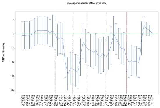 Results indicate that during the first 29 months of the intervention there was a significant main effect for the treatment group, F(16,90644) = 159.6, p < 0.00. Households in the treatment group reduced their consumption by 5.43 L per day (p = 0.025) on average compared to the control group. This is a 1.8% reduction from households’ mean daily consumption in the control group. For perspective, this is equivalent to leaving the tap running for a minute.