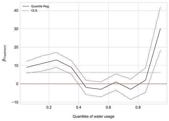 Quantile treatment effects for the first 29 months of the programme can be seen in Figure 3. This was estimated as an unconditional quantile treatment effect with only treatment assignment as the independent variable, and household water consumption in litres per day as the dependent variable. The standard errors were clustered on the household level.