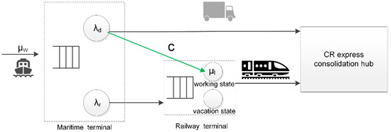 There are many studies focusing on the container terminal operations and management. Some researchers are further improving transportation services through a variety of means, including service integration, infrastructure investment, and information systems implementation [19]. Carlo et al. [20] presented an in-depth overview of storage yard operations of the maritime container terminal. A classification scheme for storage yard operations was proposed. Guo et al. [21] proposed a yard crane dispatching algorithm based on real-time data-driven simulation to solve the problem of yard crane job sequencing to minimize average vehicle waiting time. The application of Radio Frequency Identification (RFID) and other technologies in container logistics operations in ports was evaluated to realize real-time tracking of containers and equipment in the maritime terminal [22,23]. In terms of railway terminal, Boysen et al. [24] presented an exhaustive review of railway terminal operational problems and challenges. Cordeau et al. [4] reviewed papers regarding the scheduling problem in the freight transport of train. The fixed-length and fixed-time accumulation modes were discussed. In Reference [5], a finite-capacity queueing system was proposed to optimize the size of the container yard of the railway station and the frequency of the shift for CR Express. A fixed-time accumulation mode was studied in the railway terminal of CR Express. Few studies investigated the railway terminals and maritime terminal in an integrated manner. Hu et al. [25] studied the inter-terminal transport moving containers between the maritime terminal and the railway terminal. A mathematical model integrating inter-terminal transport and rail yard operation was proposed and solved by a tabu search algorithm. Caballini et al. [26] presented a planning approach to optimize railway operations in seaport terminals by adopting a queue-based discrete-time model. However, the comparison of the container accumulation modes and the cooperation between maritime and railway terminals are not well studied in these papers.
