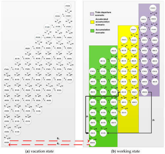The states transition diagram of the fixed-time container accumulation mode (, , , and ). (a) vacation state; (b) working state.
