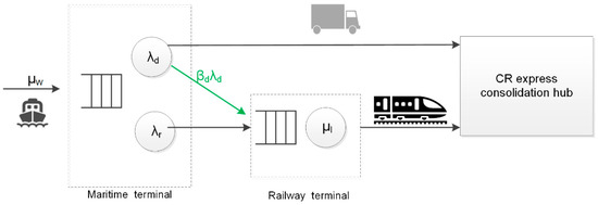- The transportation demand by train arrives at the railway container terminal in accordance with a Poisson process at constant rate . When the transportation demand by train arrives, the container transported is transferred from the maritime terminal to the railway terminal.