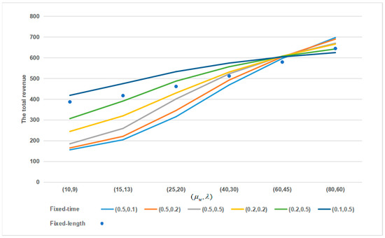 The full capacity of the train is , and the threshold in the working state of the fixed-time container accumulation mode is . The preference rate of the railway transportation mode and the shifting rate from truck to railway are set as 0.6 and 0.5, respectively. The loading time of containers on the train follows an exponential distribution with . The capacities of the storage yards reserved for the CR Express in the maritime terminal and the railway terminal are . The arrival rate and total demand rate are set to (10, 9), (15, 13), (25, 20), (40, 30), (60, 45), and (80, 60) in this subsection, to present the small and large intermodal transportation demand. is set to (0.5, 0.1), (0.5, 0.2), (0.5, 0.5), (0.2, 0.2), (0.2, 0.5), and (0.1, 0.5) to present different types of fixed-time container accumulation modes.
