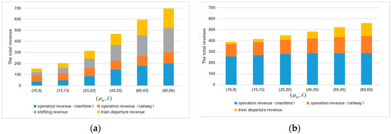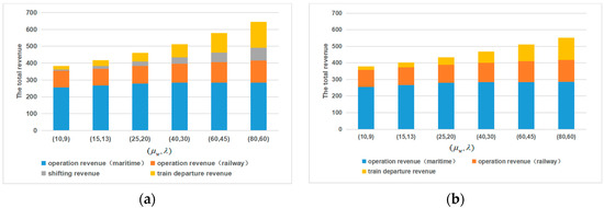 Furthermore, the comparisons of the total revenues between the two container accumulation modes in the situations with cooperation can explain the results of Section 4.2. As shown in Figure 5a and Figure 6a, the operation revenues of the maritime and railway terminals in the fixed-time container accumulation mode are less than the fixed-length container accumulation mode. However, their differences decrease gradually, as the intermodal transportation demands increase. This can be explained by the steady-state probabilities of states, as shown in Table 3 in the situations with cooperation. Comparing with the fixed-time container accumulation mode, the higher probabilities are distributed at the states with larger number of containers in the maritime and railway terminals (i.e., larger ) in the fixed-length container accumulation mode, under both small and large intermodal transportation demand. In the fixed-time container accumulation mode, the higher probabilities move from the states with small number of the containers to the states with large number of the containers in the terminals (i.e., from small to large ), as the demand increases. On the other hand, as shown in Figure 5a and Figure 6a, the shifting revenues and the train departure revenues of the fixed-time container accumulation mode increase much faster than the fixed-length container accumulation mode, as the demands increase. Hence, the fixed-time container accumulation mode with large ratios of to (i.e., (0.5, 0.1)) is worse under the small intermodal transportation demand and is better under the large intermodal transportation demand, compared with the fixed-length container accumulation mode.