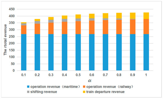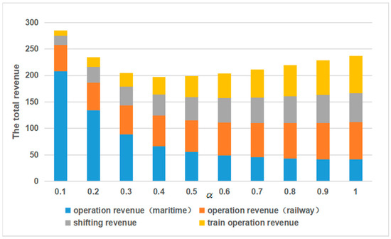 The impact of parameter on the total revenue is studied in this section. represents the railway transportation preference rates, which are set to 0.1, 0.2, ..., and 1.0. For example, means all containers are transported by railway to the CR Express consolidation hub and no containers are transported by truck. In this section, the following parameters are fixed for simplicity: is set at (15, 13), and is set at (0.5, 0.1) as an example to present the fixed-time container accumulation mode.