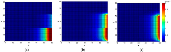 Figure 9 shows the effect of on the total revenues of the fixed-time container accumulation mode. The operation revenues of the maritime terminal decrease significantly, and the operation revenues of the railway terminal increase slightly as increases. Figure 10 shows the distribution of the higher probabilities moving to the states of the smaller number of the containers in the maritime terminal (i.e., smaller ), as increases. The distribution of the higher probabilities remains in the states of small number of containers in the railway terminal (i.e., almost the same range as ), for all . The shifting revenues and the train departure revenues increase as the value of increases. In summary, first, the total revenues significantly decrease, and then increase as the value of increases. The largest total revenue is reached at , where the operation revenues of the maritime terminal account for the majority of the total revenue, as Figure 9 illustrates. It is the mutually beneficial and sustainable way for the cooperation between the maritime and the railway terminals. Although the maximum total revenue is not obtained, it is better to set more than 0.5.