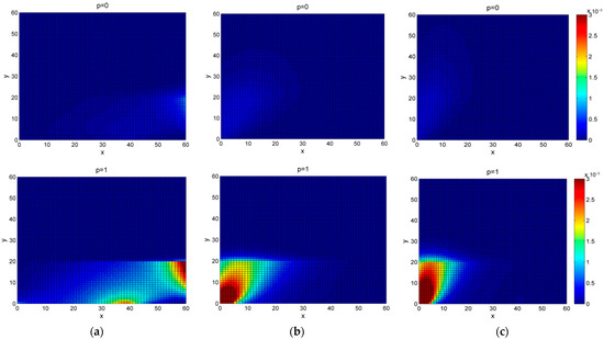 The steady-state probability of the state in the fixed-time container accumulation mode under demand (15, 13) for (a), (b), and (c).