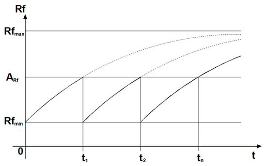 Risk acceptance limits are defined according to maintenance management policies. Once ARf has been established, if Rfmin is the façade’s risk value at the delivery phase and Rfmax is the theorised maximum risk value which a façade can assume, then it is possible to simulate the risk trend over time as depicted in Figure 1, where it has been assumed that maintenance interventions are made for Rf = ARf in order to maintain required performance levels.
