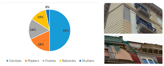 A consistent part (38%) of the analysed façades has safety nets as protective measures against falling bodies from balconies and cornices (Figure 3); this finding outlines the relevance of the event in Naples.