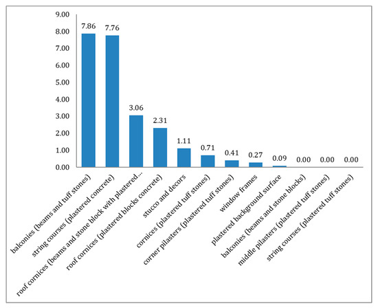 Balconies and roof cornices resulted in being the most affected by gaps. Furthermore, falling items regarded elements’ corners. It can be deduced that balconies and roof cornices’ intrinsic hazards are the highest, and the amount of projecting surface does not influence elements’ hazard (Figure 5).