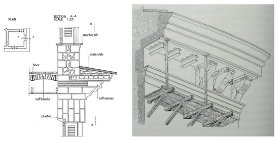 As mentioned, Umberto I avenue offers a set of similar façades built mostly at the beginning of the 20th century. In fact, in the late 19th century, the historic centre of Naples suffered a cholera epidemic, which led to a restoration plan known as the “disembowelment plan” (they demolished old buildings in order to enlarge the streets and they rebuilt buildings’ façades) to improve urban health and hygiene. A new construction company was organized specifically for this purpose, which concluded the renovation interventions by 1920. The review of historical tender specifications reported in De Sivo et al. [30] was essential for the purpose of this paper, as it led to a deep knowledge of construction materials and techniques used during the reconstruction process. Buildings’ façades are composed of tuff masonry, from 5 metres to 90 centimetres in width, decorated with plaster and stucco elements. Plasters were installed following specific rules, moving from a rough layer (made of sand and lime) to a finishing layer (which added marble powder). For cornices and frames, concrete was added to the mortar before the stucco finishing surface. Roof cornices, of great interest in this paper, were built upon stone blocks (tuff stones or lapillus mortar) covered by a concrete mortar and finished with stucco. In cases of projections greater than 50 cm, a reinforced structure was necessary to sustain them (Figure 6). Balconies could vary from 50 cm to 110 cm and they were made of steel beams, with a spacing of 80 cm, and tuff stones or drilled bricks. Other cornices, frames and pilasters were obtained by plastered masonry.