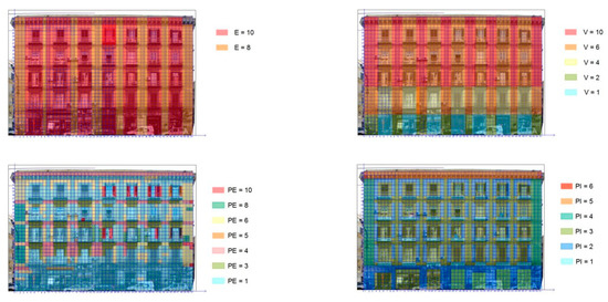 Considering the extrinsic hazard values of Table 4, the authors assigned to each façade’s element a PE value. Comparative analysis of the rate of the evolution of degradation phenomena was not available, so identified anomalies were considered fast evolving as a security advantage. Vulnerability values have been assigned considering those reported in Table 1. Finally, exposure values have been assigned according to Table 2, considering that the analysed façade faces one of most crowded Neapolitan streets, where many commercial activities are placed. The resulting maps are depicted in Figure 8.