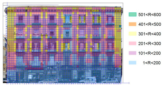 Usually a risk value is obtained by multiplying factors (i.e., hazard, vulnerability and exposure). The risk value ascribed to each façade’s cell is obtained as in Equation (2):