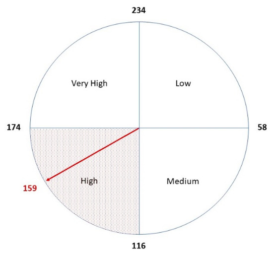 The arising risk map is reported in Figure 9. The overall risk indicator (Rf = 159) falls within the third quadrant of a hypothetical risk dashboard (Figure 10), considering that the minimum risk for the analysed façade is Rfmin = 105 and the maximum is Rfmax = 339. Indeed, for a given façade, it is possible to determine its minimum and maximum risk value corresponding to the best-case scenario (e.g., at the delivery phase) and the worst case scenario (e.g., assuming highest values of hazard, vulnerability and exposure can be applied). The resulting risk range can be divided, as a first approximation, into four parts equally. To each interval, a qualitative judgement can be associated (low, medium, high, very high risk). In this way, it is possible to perform qualitative assessment of the same building at different moments (which can help with monitoring the trend of a façade’s risk over time) or to compare several buildings’ façades at once or different moments (this can provide policies about where to intervene more urgently).