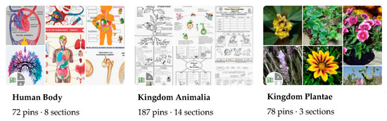 The board on the human body (https://pin.it/4ShAVVE accessed on 12 January 2021) only had 68 contributions, which were divided into eight sections, which were the organs of the body, the nervous system, locomotor apparatus, the reproductive system, the respiratory system, the digestive system, the circulatory system, and the excretory system.