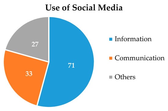 As a starting point, 98.5% of the participants had an account on a social media, the most used being Instagram, with 87% of the participants having an account on this social media, followed by Facebook with 73.3%. Although, at the management level, the percentage of participants who were active on social media decreased to 79.4% of the participants. Regarding their reason for using social media (Figure 3), a large proportion of the participants (n = 71) recognized that their use of social media was for staying informed; meanwhile, only 33 of the participants used social media to communicate with other people.