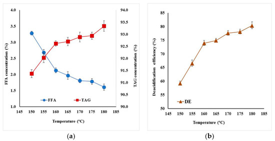 Seven molecular distillation experiments were performed at different evaporator temperatures between 150 °C to 180 °C, fixed feed flow rate (2 mL/min), wiper rolling speed (300 rpm), pressure (0.1 Pa), and condenser temperature (19 °C). At this lower pressure, the mixture boiling temperature was not too high and TAG could not degrade (for a separation at 200 °C, it was observed that compounds with lower number of carbons appeared due to the glycerides degradation). During the separation process, light product rich in FFA and heavy product rich in TAG were separated. Increasing the evaporator temperature, the FFA concentration in oil decreased from 3.29% at 150 °C to 1.61% at 180 °C (Figure 1a), 90% for all samples. At temperature greater than 170 °C, the composition of FFA had a smaller change. The composition of TAG in oil was also affected by the evaporation temperature, increasing by 2% from 91.37% at 150 °C to 93.34% at 180 °C (Figure 1a). The deacidification efficiency increased with the temperature, having a maximum value of 80.39% at 180 °C (Figure 1b).