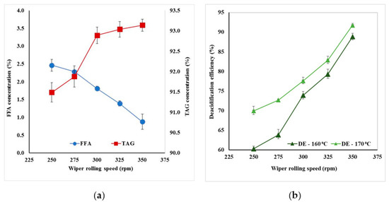 Effect of wiper rolling speed at constant flow rate (2 mL/min) and evaporation temperature (170 °C) on (a) FFA and TAG composition in deacidified oil, (b) deacidification efficiency.