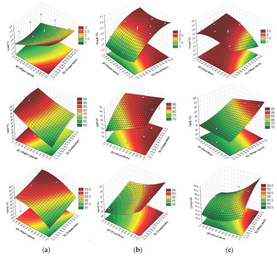Table 6 shows the analysis of variance (ANOVA) for all the responses investigated in this study. The models, linear, quadratic, and interaction terms of the three independent variables (temperature, speed, and flow rate), lack of fit (model error), and pure error (replicates error) were evaluated according to their degree of freedom, sum of squares, mean square, F-value, p-value, and model coefficient of determination R2. A model is good if it has a high F-value, low p-value, insignificant lack of fit, and high R2. The results of this analysis are presented in Table 6. For the FFA content (Y1), the ANOVA analysis of the quadratic model showed that the F-value of 21.156 implies that the model is significant at p < 0.001. The coefficient of determination R2 is 0.965, measuring how properly experimental data are approximated the regression model. The lack of fit was not significant (p > 0.05) and indicated that the model prediction is adequate. Examination of the coefficients for the first response indicated that the linear terms as evaporator temperature, wiper speed, and flow rate and the interaction terms between wiper speed and flow rate were highly significant with higher F-value and lower p-value. Quadratic terms of evaporator temperature and flow rate and interaction term between temperature and speed were significant, while quadratic term of speed and interaction term between temperature and flow rate were not significant with low F-value and p > 0.05. For the deacidification efficiency (Y2), the ANOVA analysis showed that a greater F-value of 2123.15 implies that the model is significant at p < 0.001. The coefficient of determination R2 was 0.999 and all the linear, quadratic, and interaction terms were significant (p < 0.05), except the quadratic effect of flow which was insignificant at p > 0.05. To determine if the models were compatible with experimental data, lack of fit test was calculated from residuals of fitting. The model was adequate, as indicated by the error analysis that showed insignificant lack of fit with p > 0.05. In case of the third response, TAG concentration (Y3), the obtained results showed that the model was significant with a F-value of 29.522 and p < 0.001. The coefficient of determination R2 was 0.974. All the linear terms were highly significant with high F-value and low p-value, while the quadratic term of evaporator temperature and the interaction term between temperature and speed were insignificant with low F-value and p > 0.05.